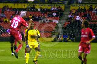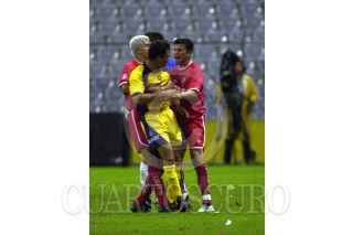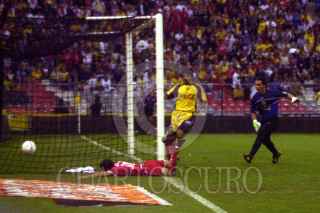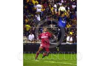 Adrian García jugador del Toluca despeja de cabeza ante la proximidad del jugador del América en terreno peligroso. Hasta la mitad del segundo tiempo América ganaba 2-1 al Toluca. FOTO: David Bolaños/CUARTOSCURO.COM