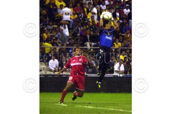Adrian García jugador del Toluca despeja de cabeza ante la proximidad del jugador del América en terreno peligroso. Hasta la mitad del segundo tiempo América ganaba 2-1 al Toluca. FOTO: David Bolaños/CUARTOSCURO.COM