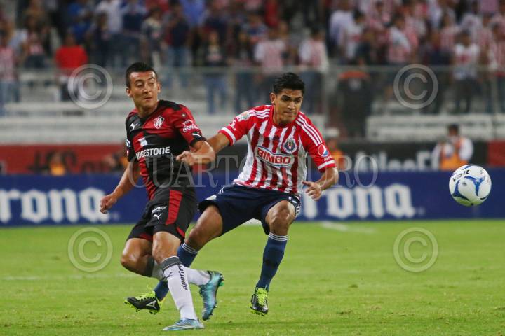 GUADALAJARA, JALISCO. 11NOVIEMBRE2015.- El jugador de Chivas Ángel Zaldívar, disputa un balón frente al guardameta de Atlas Miguel Fraga y el defensor Carlos Arreola, esto en partido correspondiente a la Jornada 14 del Torneo Apertura 2015 de la Liga MX, en donde se enfrentaron los equipos de los Zorros del Atlas frente a las Chivas de Guadalajara, el marcador final fue de 1-0 a favor del equipo visitante en partido que se jugo en el Estadio Jalisco. FOTO: FERNANDO CARRANZA GARCIA / CUARTOSCURO.COM
