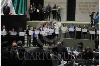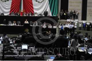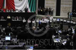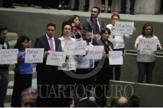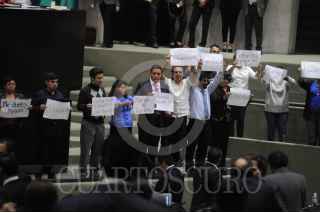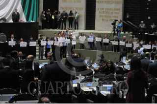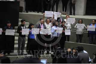 MÉXICO, D.F., 12NOVIEMBRE2015.- Diputados de MORENA, se manifestaron con pancartas durante la postura de Margarita Cuata en la sesión donde se discutió el presupuesto de la federación del 2016. FOTO: SAÚL LÓPEZ /CUARTOSCURO.COM