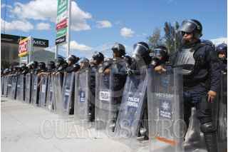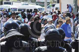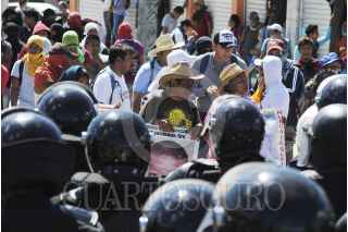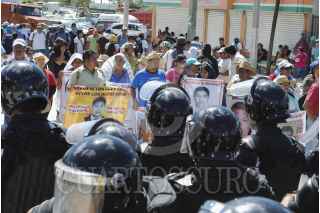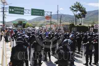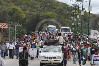 CHILPANCINGO, GUERRERO, 14 NOVIEMBRE 2015.- Contingente de manifestantes conformados por estudiantes de la normal rural Raúl Isidro Burgos de Ayotzinapa, padres de familia de los 43 jóvenes desaparecidos en Iguala y profesores de la Ceteg de la fracción de Ramos Reyes Guerrero llegaron apoyar el bloqueo, al lugar arribaron policías antimotines a dialogar con los manifestantes para liberar la arteria vehicular, quienes llegaron a un acuerdo y después de permanecer bloqueada la autopista por hora y media en el Parador del Marques el contingente emprendió una marcha de Sur – Norte con dirección al palacio de gobierno y hacer un mitin por la represión que sufrieron por parte de Zeferino Torreblanca en el sexenio que goberno y por el hechos suscitados en el libramiento de cuota Chilpancingo – Tixtla. FOTO: JOSÉ I. HERNÁNDEZ /CUARTOSCURO.COM