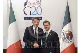 ANTALYA, REPÚBLICA DE TURQUÍA, 16NOVIEMBRE2015.- El Presidente Enrique Peña Nieto se reunió hoy, en el marco de su participación en la Cumbre de Líderes del G20, con el Presidente del Consejo de Ministros de la República Italiana, Matteo Renzi, quien expresó el interés por incrementar las inversiones italianas en México, como muestra de confianza en su estabilidad económica y política. FOTO: PRESIDENCIA /CUARTOSCURO.COM