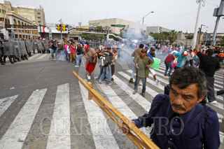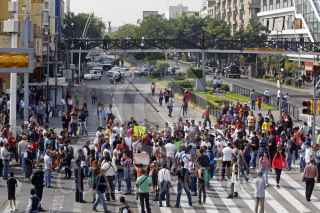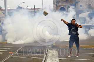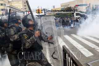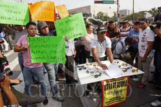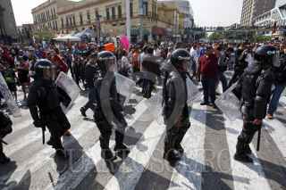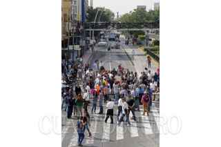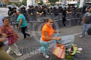 GUADALAJARA, JALISCO. 25NOVIEMBRE2015.- Comerciantes de la zona de Obregón se manifestaron en contra de las determinaciones tomadas por el Presidente Municipal de Guadalajara, Enrique Alfaro, de impedir que se instalen en la vía publica los comerciantes ambulantes que comúnmente lo hacían en la zona y en protesta bloquearon la Calzada Independencia al cruce con Javier Mina en el primer cuadro de la ciudad, lo que afecto a los usuarios del macrobús ya que por una de esas arterias corre dicho transporte, al no haber acuerdo entre comerciantes y autoridades estas usaron la fuerza publica para liberar las vías lo que ocasionó una pequeña trifulca, pero en donde al final se logro el cometido por parte de las autoridades. FOTO : FERNANDO CARRANZA GARCIA / CUARTOSCURO.COM