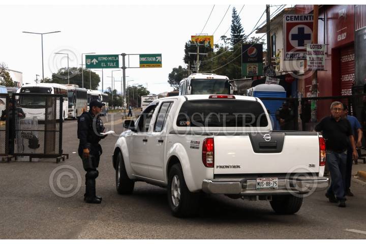 TLALIXTAC DE CABRERA, OAXACA, 27NOVIEMBRE2015.- Cinco mil elementos de la Policía Federal resguardan las inmediaciones de la Ciudad Administrativa, complejo gubernamental en el que se llevará a cabo este sábado la aplicación de la evaluación docente, esto con la intención de evitar cualquier intento de boicot por parte de profesores de la sección 22 de la CNTE. Los uniformados revisan los vehículos que ingresan a la zona del cerco y que viven o trabajan en la zona. FOTO: ARTURO PÉREZ ALFONSO /CUARTOSCURO.COM