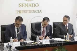 MÉXICO, D.F., 02DICIEMBRE2015.- Los Senadores del Partido Acción Nacional Roberto Gil y Rosa Adriana Díaz realizaron una firma de convenio de colaboración con el Instituto Mexicano para la Competitividad. FOTO: SENADO /CUARTOSCURO.COM