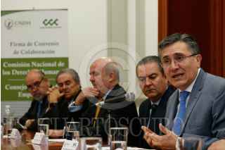 MÉXICO, D.F., 03DICIEMBRE2015.- Firmaron un convenio el Ombudsman nacional, Luis Raúl González Pérez y el Presidente del Consejo Coordinador Empresarial, Gerardo Gutiérrez Candiani, mediante el cual buscan, entre otras cosas, combatir la impunidad en el país, para avanzar hacia un estado democrático de derecho. El convenio plantea generar una efectiva cultura de protección y defensa de los derechos humanos, que combata los altos niveles de impunidad, de inseguridad y de violencia, además de que coadyuve a que las empresas conozcan sus obligaciones en materia de derechos, respecto de sus trabajadores, clientes y proveedores. FOTO: CNDH /CUARTOSCURO.COM
