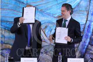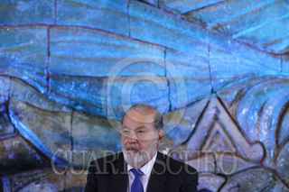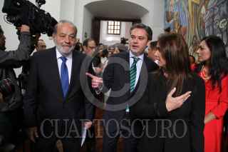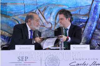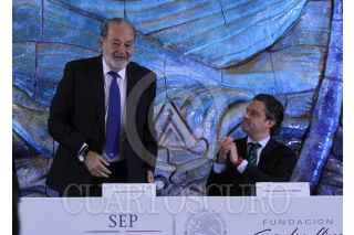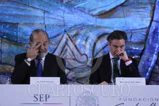MÉXICO, D.F., 03DICIEMBRE2015.- Carlos Slim Helú, Presidente Honorario Vitalicio de Grupo Carso y Fundación Carlos Slim y Aurelio Nuño, Secretario de Educación Pública durante la firma de "Convenio entre la SEP y la Fundación Slim", que plantearía un intercambio audiovisual, cursos masivos en línea e intercambio de materiales audiovisuales para las señales de la TV educativa. FOTO: ADOLFO VLADIMIR /CUARTOSCURO.COM