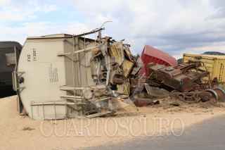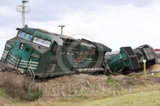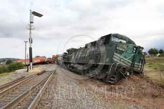 TLAXCALA, TLAXACALA, 03DICIEMBRE2015.- Diez vagones y dos locomotoras descarrilaron a la altura del kilómetro 157+500, del ramal México-Veracruz a la altura de San Cosme Xaloztoc. Autoridades de Protección Civil reportan al garrotero Francisco Valdivia Hernández como el único lesionado, derrame de diésel y de químicos. La situación está bajo control desde las 8:45 de la mañana, personal de ferrosur, en apreciaciones preliminares, comentó que pudo haber sido una falla de riel u obra de vandalismo. Se trata del tren conocido como la bestia en la que usualmente se transportan migrantes centroamericanos y que en esta ocasión únicamente transportaban carga. Cabe destacar que este descarrilamiento no afecta el tráfico de trenes entre México y Veracruz, ya que se trata de un ramal que comunica hacia empresas del corredor industrial Xaloztoc de la entidad tlaxcalteca. FOTO: JORGE LEZAMA /CUARTOSCURO.COM
