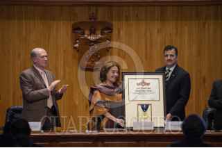 GUADALAJARA, JALISCO, 03NOVIEMBRE2015.- La Universidad de Guadalajara entrego el reconocimiento "Honoris Causa" post mortem al escrito Eduardo Galeano. Su vida viuda, Helena Villagra, dedicó el título a los 43 normalistas desaparecidos en Ayotzinapa, la entrega estuvo a cargo del Rector General de la Universidad, Itzcóatl Tonatiuh Bravo Padilla y el Vicerrector Ejecutivo, Miguel Ángel Navarro Navarro. FOTO: Jorge Alberto Mendoza /UdeG /CUARTOSCURO.COM