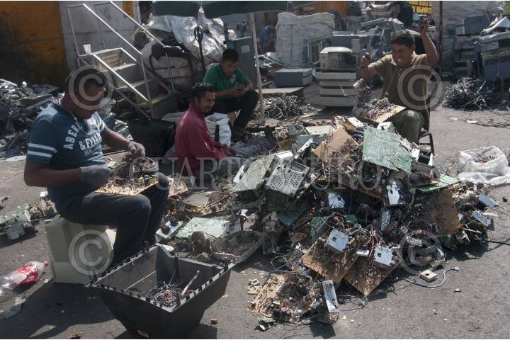 MÉXICO, D.F., 04DICIEMBRE2015.- El día de ayer el presidente de la República Enrique Peña Nieto entregó el aparato de señal digital número 8 millones 200 mil del total de 9.7 millones de televisores que se repartirán por el apagón analógico anunciado para el 31 de diciembre de 2015. A lo largo de estos meses se intensificó la campaña en los medios de comunicación para que la población en general se prepare ante esta medida y adquiera una pantalla digital o compre un decodificador para poder captar la señal en los televisores tradicionales. En contraparte, la campaña para recolectar los cientos de miles de viejos aparatos que se desecharán no se difunde con la misma intensidad; algunos de los componentes de estos televisores son muy dañinos para el medio ambiente. En la imagen recolectores del tianguis de Santa Cruz Meyehualco, ubicado en Eje 6 y Periférico Oriente, trabajan quitando el cobre y otros materiales valiosos a los aparatos. FOTO: DIEGO SIMÓN SÁNCHEZ /CUARTOSCURO.COM