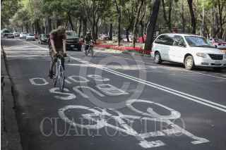 MÉXICO, D.F., 07DICIEMBRE2015.- Las ciclistas sobre avenida Reforma comparten un carril confinado exclusivamente para ellos y autobuses con taxistas, autos particulares y motociclistas, lo cual aumenta el riesgo de accidentes. FOTO: ISABEL MATEOS /CUARTOSCURO.COM