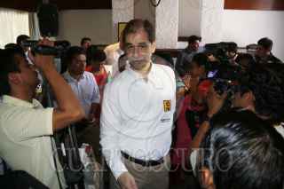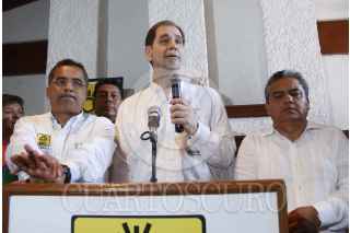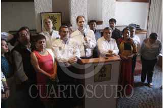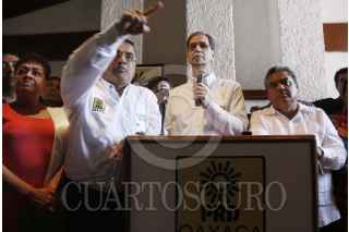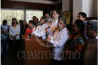 OAXACA, OAXACA, 11DICIEMBRE2015.- El dirigente nacional del PRD, Agustín Basave flanqueado a la izquierda por el presidente estatal Carol Antonio Altamirano y a la derecha por el secretario general a nivel estatal, Hugo Jarquín, visitó el estado de Oaxaca donde lanzó un nuevo llamado al presidente nacional de Morena, Andrés Manuel López Obrador a conformar una alianza para las elecciones de gobernador, principalmente para los estados de Oaxaca y Zacatecas, esto con la firme intensión de impedir que el PRI pueda regresar al gobierno. FOTO: ARTURO PÉREZ ALFONSO /CUARTOSCURO.COM