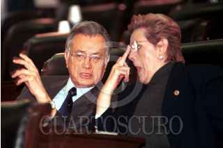 Los legisladores priístas Manuel Bartlett y Laura Alicia Garza Galindo conversan durante la sesión en la Cámara de Senadores. FOTO: Christian Palma/CUARTOSCURO.COM