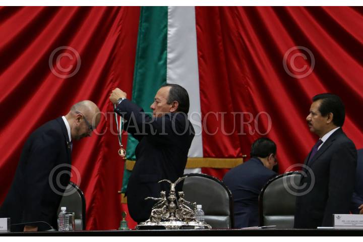 MÉXICO, D.F., 15DICIEMBRE2015.- Entregan la medalla al mérito cívico "Eduardo Neri y legisladores de 1913" al astronauta Rodolfo Neri Vela en sesión solemne en el pleno de la mesa directiva de la Cámara de Diputados. FOTO: SAÚL LÓPEZ /CUARTOSCURO.COM