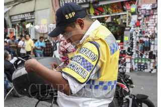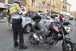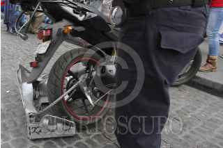 MÉXICO, D.F., 18DICIEMBRE2015.- Las multas por violar las normas del nuevo reglamento de tránsito continúan. En la imagen, un policía de tránsito autorizado para infraccionar coloca "la araña" para inmovilizar a una motocicleta que no estaba estacionada en el debido lugar. FOTO: MARÍA JOSÉ MARTÍNEZ /CUARTOSCURO.COM