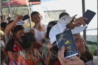 TAPACHULA, CHIAPAS, 19DICIEMBRE2015.- Los integrantes de la Caravana de Madres Migrantes se despidieron del territorio nacional tras dos semanas de intensa búsqueda de sus hijos por el país, algunas parten con noticias y otras sin nada, sin embargo esperan regresar el próximo año para continuar con su peregrinar. La imagen corresponde en la estación migratoria de Tapachula en donde muestran sus pasaportes. FOTO: MOISÉS PABLO /CUARTOSCURO.COM
