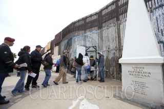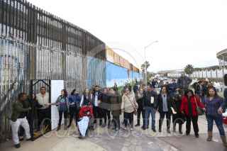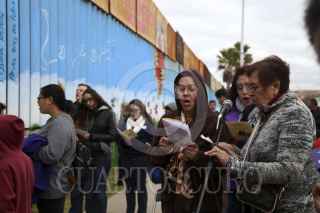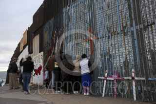 TIJUANA, BAJA CALIFORNIA,19DICIEMBRE2015.-Con la intención de recordar a los migrantes que han muerto en su intento de cruzar ilegalmente a Estados Unidos, este día se realizó la posada 'Sin Fronteras' la cual se realizó en ambos lados del muro divisorio a la altura de Playas de Tijuana y que contó con la participación de organizaciones civiles y de protección a los derechos humanos quienes durante el evento simularon cruzar el muro a través de una puerta, ademas de cantar villancicos y escuchar a los oradores. FOTO CHRISTIAN SERNA /CUARTOSCURO.COM