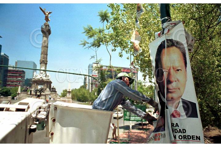 A unas horas de que terminaran los festejos de los candidatos electos, decenas de trabajadores de la delegación Cuauhtémoc retiraron la propaganda política que se encontraba en paseo de la Reforma. FOTO: Germán Romero/CUARTOSCURO.COM