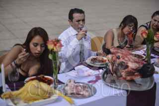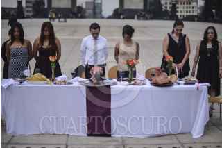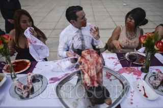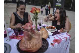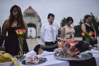 MÉXICO, D.F., 21DICIEMBRE2015.- Integrantes de Animal Héroes, organización orientada a la lucha por el reconocimiento y la defensa de los derechos de todos los animales como seres merecedores de una vida digna, de respeto y libres de sufrimiento; realizaron el acto "Diciembre consciente" realizado en la explanada del Monumento a la Revolución y que trata de concientizar sobre el no consumo de alimentos procedentes de animales en la cena de Noche Buena. FOTO: ADOLFO VLADIMIR /CUARTOSCURO.COM