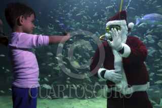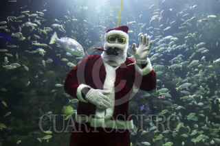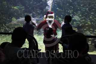 VERACRUZ, VERACRUZ, 22DICIEMBRE2015.- Un buzo vestido de Santa Claus saluda desde la pecera oceánica del Acuario de Veracruz a los niños, jóvenes y adultos que acuden al lugar como parte de las actividades del acuario en estas épocas decembrinas. FOTO: ILSE HUESCA /CUARTOSCURO.COM
