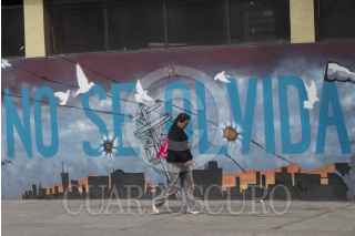 MÉXICO, D.F., 28DICIEMBRE2015.- Una mujer camina sobre la avenida Flores Magón en donde se lee una pinta en un muro "No se olvida", en referencia a la matanza de 1968. Aunque la frase esta muy ha doc para estos últimos días del año. FOTO: MOISÉS PABLO /CUARTOSCURO.COM