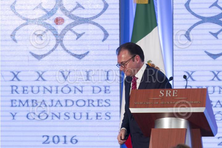 MÉXICO, D.F., 07ENERO2016.- Luis Videgaray Caso, secretario de Hacienda y Crédito Publico, participó en la XXVII Reunión de Embajadores y Cónsules 2016, que se llevó a cabo en la sede de la cancillería, en la que destacó que no se cobrarán más impuestos y que la depreciación del Yuan chino es un alerta para las economías globales. FOTO: MOISÉS PABLO /CUARTOSCURO.COM