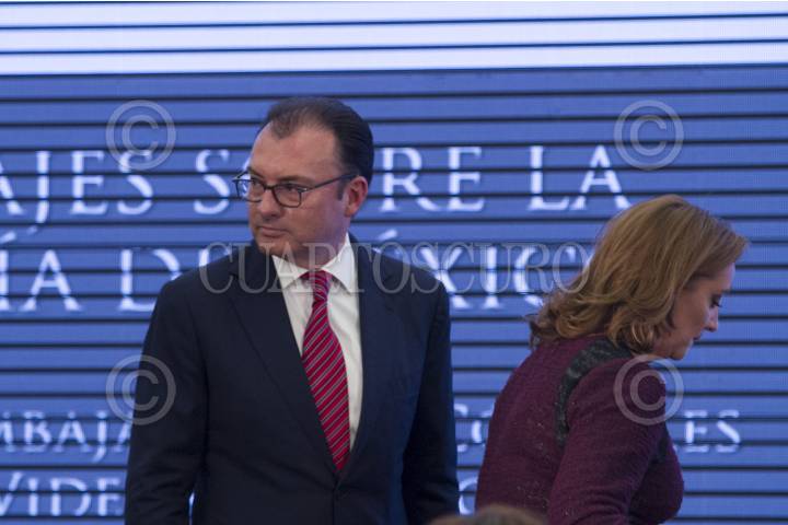 MÉXICO, D.F., 07ENERO2016.- Luis Videgaray Caso, secretario de Hacienda y Crédito Publico, participó en la XXVII Reunión de Embajadores y Cónsules 2016, que se llevó a cabo en la sede de la cancillería, en la que destacó que no se cobrarán más impuestos y que la depreciación del Yuan chino es un alerta para las economías globales. FOTO: MOISÉS PABLO /CUARTOSCURO.COM