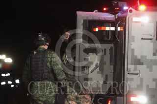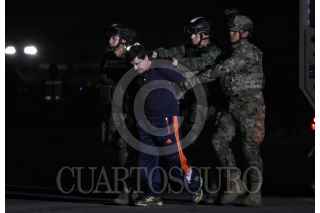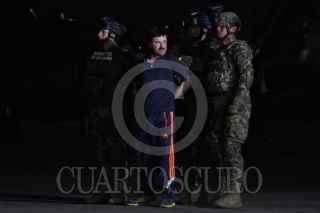 MÉXICO, D.F., 08ENERO2016.- Joaquín Guzmán Loera "El Chapo", líder del cártel de Sinaloa, fue recapturado esta mañana por elementos de la Fuerza Armada de México. Según cifras de la DEA, el Chapo es uno de los criminales que más cocaína y marihuana ha hecho circular en Estados Unidos y uno de los criminales más buscados en México. En la imagen el criminal es trasladado al penal del Altiplano en el Hangar de la Marina. FOTO: ISAAC ESQUIVEL /CUARTOSCURO.COM