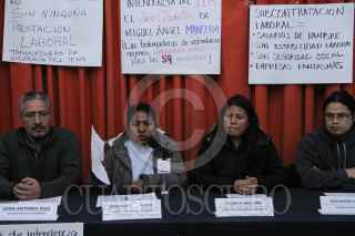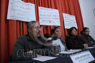 MÉXICO, D.F., 13ENERO2016.- Juan Antonio Díaz, Secretario General de SUITIEMS, Guadalupe Carrasco, Blanca Arellano, trabajadoras despedidas y Alejandro Cerezo, del Comité Cerezo, durante la conferencia de prensa sobre el despido injustificado de trabajadoras de intendencia del Instituto de Educación Media Superior del Distrito Federal, durante los días 15 y 19 de fueron notificadas por la empresa Roc-man que habían sido despedidas de diferentes planteles. FOTO: ADOLFO VLADIMIR /CUARTOSCURO.COM
