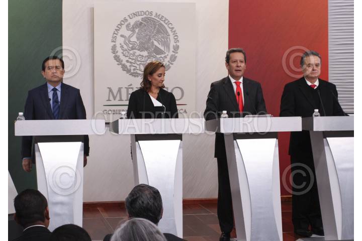 MÉXICO, D.F., 15ENERO2016.- Debido a la gira que el presidente Enrique Peña Nieto emprenderá en los Países Árabes, la secretaria de Relaciones Exteriores, Claudia Ruiz Massieu; el secretario de Economía, Ildefonso Guajardo; el de Energía, Pedro Joaquín Coldwell, y el vocero de Presidencia, Enrique Vázquez, ofrecieron una conferencia de prensa conjunta para dar detalles en torno a la gira de trabajo en Medio Oriente. FOTO: MARÍA JOSÉ MARTÍNEZ /CUARTOSCURO.COM