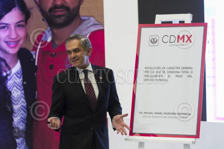 MÉXICO, D.F., 18ENERO2016.- Miguel Ángel Mancera, Jefe de Gobierno, encabezó la firma y publicación de instrumentos que condonan y subsidian el pago de impuesto predial a los capitalinos, en ceremonia realizada en el Antiguo Palacio del Ayuntamiento. FOTO: MOISÉS PABLO /CUARTOSCURO.COM