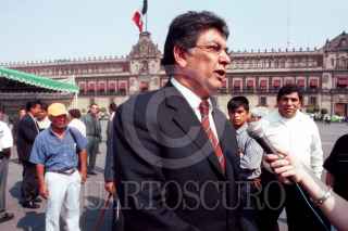José Murat, gobernador de Oaxaca, acompañado de legisladores locales, empresarios e intelectuales, en el transcurso del día mantuvierón un plantón en la plancha del zocalo capitalino para demandar una audiencia con el presidente Fox ya que la SCT quiere quitarle el presupuesto que le asigno la Cámara de Diputados para el mantenimiento y construcción de carreteras. FOTO: Oswaldo Ramírez/CUARTOSCURO.COM