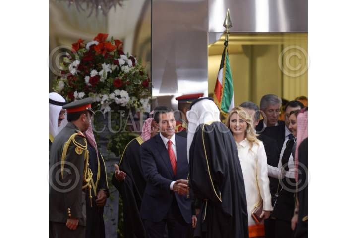 KUWAIT, 19ENERO2016.- El Presidente Enrique Peña Nieto, acompañado de su esposa, la señora Angélica Rivera de Peña, arribó hoy a Kuwait, para realizar una Visita de Estado. Fue recibido por el Jeque Fahd Saad Al-Sabah, Consejero del Emir, en funciones de Jefe de la Misión de Honor para acompañar al Presidente de México durante su visita. FOTO: PRESIDENCIA /CUARTOSCURO.COM