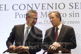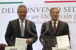 MÉXICO, D.F., 20ENERO2016.- Ernesto Torre Cantú, director del grupo financiero Banamex, y José Antonio Meade, secretario de Desarrollo Social, firmaron un convenio de colaboración en la cual la institución financiera aportará 60 millones de pesos en proyectos conjuntos. FOTO: MOISÉS PABLO /CUARTOSCURO.COM
