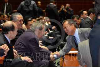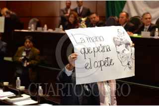 MÉXICO, D.F., 20ENERO2016.- Miguel Ángel Mancera, asistió la mañana de hoy a la sesión de la Comisión Permanente del Congreso, para la declaratoria de constitucionalidad de la reforma política de la Ciudad de México. En la imagen, un legislador de Morena muestra una pancarta critica al jefe de gobierno. FOTO: CUARTOSCURO.COM