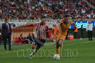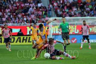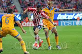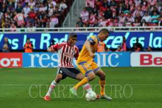 ZAPOPAN, JALISCO. 24ENERO2016.- El jugador de Chivas Orbelín Pineda, disputa un balón frente al contrario de Tigres, Israel Jiménez, esto en partido correspondiente Jornada 3 del Torneo Clausura 2016 de la Liga MX, en donde se enfrentaron los equipos de las Chivas de Guadalajara contra Tigres, en encuentro que se llevo a cabo en el Estadio Omnilife y en donde el marcador final fue de 2-2. FOTO : FERNANDO CARRANZA GARCIA / CUARTOSCURO.COM