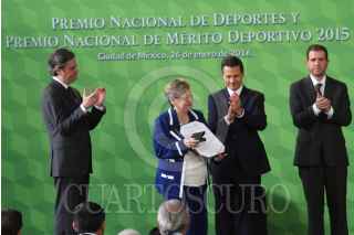MÉXICO, D.F., 26ENERO2016.- Enrique Peña Nieto, Presidente de México, entregó el premio nacional del deporte y el premio nacional del mérito deportivo 2015, en la residencia oficial de Los Pinos. En la imagen Martha Saldívar, viuda del promotor boxistico José Sulaimán, quien recibió un reconocimiento postmortem por su labor en favor del boxeo nacional e internacional. FOTO: MOISÉS PABLO /CUARTOSCURO.COM