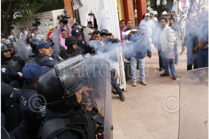 OAXACA, OAXACA, 26ENERO2016.- Integrantes del Sindicato de Trabajadores y Empleados de la Universidad Autónoma Benito Juárez de Oaxaca (Steuabjo) realizaron un paro de doce horas y bloquearon la avenida Universidad para exigir respuesta a su pliego petitorio. Sin embargo elementos de la Secretaría de Seguridad Pública (SSP) desalojaron a los manifestantes quienes habían retenido más de 10 unidades del transporte público, durante el operativo hubo tres detenciones, además los uniformados hicieron uso de gas lacrimógeno para dispersar a los manifestantes. FOTO: ARTURO PÉREZ ALFONSO /CUARTOSCURO.COM
