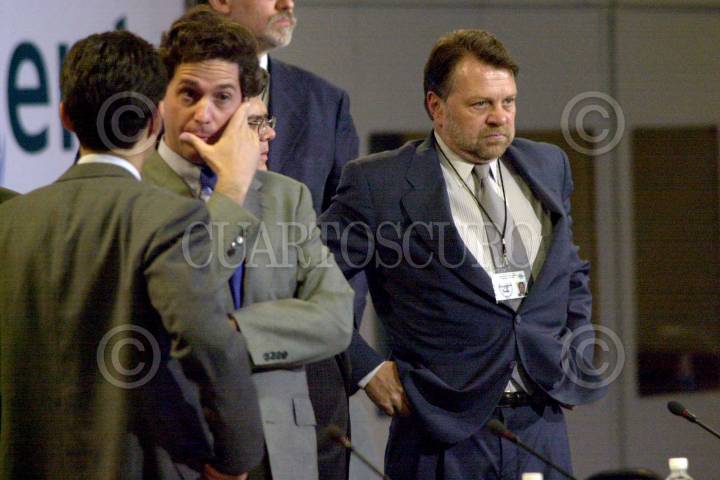 John Dimitri Negroponte ex embajador de E.U. en nuestro país y representante ante la ONU, saluda a Jorge Eduardo Navarrete diplomatico Mexicano, antes de la conferencia donde anuncio ayuda a los paises sub desarrollados. FOTO: Pedro Valtierra/CUARTOSCURO.COM