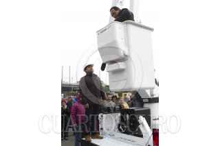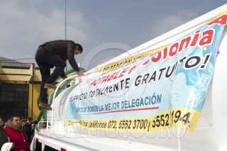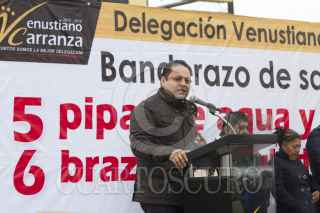 MÉXICO, D.F., 28ENERO2016.- El delegado de Venustiano Carranza Israel Moreno dió al banderazo de salida de cinco pipas de agua y tres nuevas grúas con brazos mecánicos de 13 de metros de longirud con canastillas, en la explanada delegacional. El titular de la delegación aseguró que cuentan con 22 carros tanque apenas van a poder sastifacer la crisis de agua que se enfrentará por el corte del suministro por los trabajos en el Sistema Cutzamala. FOTO: MOISÉS PABLO /CUARTOSCURO.COM