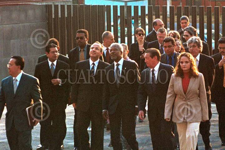 Kofi Annan, ayuda a colocar la silla a Beatriz Paredes, presidenta de la Mesa Directiva de la Cámara de Diputados, durante la firma del libro de visitantes. FOTO: Eunice Adorno/CUARTOSCURO.COM