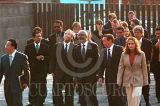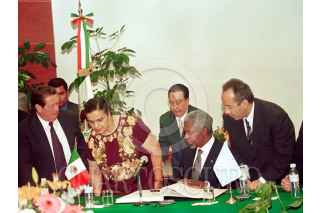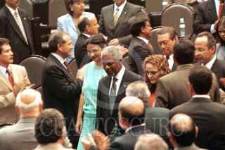 Kofi Annan, ayuda a colocar la silla a Beatriz Paredes, presidenta de la Mesa Directiva de la Cámara de Diputados, durante la firma del libro de visitantes. FOTO: Eunice Adorno/CUARTOSCURO.COM