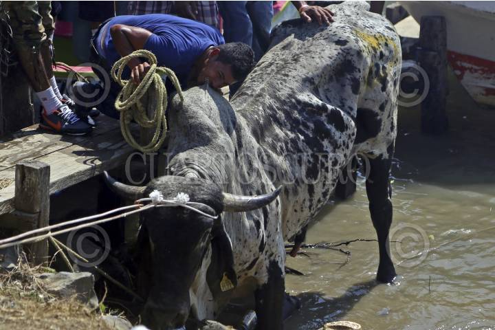 TLACOTALPAN, VERACRUZ, 01FEBRERO15.- Se realiza el tradicional embalse de toros en las Fiesta de la Candelaria; 6 toros fueron liberados ante una multitud que entre alcohol y adrenalina jalaron, corretearon, golpearon e incluso mordieron a las nerviosas criaturas que solo buscaban resguardarse, a pesar de que las autoridades se mantenían al pendiente de los sucesos uno de los toros saltó la valla y durante hora y media permaneció a la orilla del río con el riesgo de ahogarse y morir, horas después lograron sacarlo. FOTO: ILSE HUESCA /CUARTOSCURO.COM