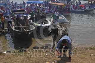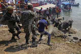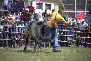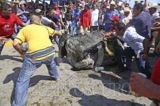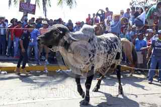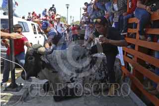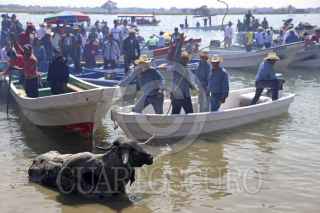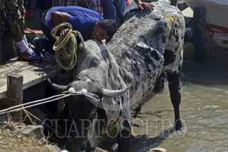 TLACOTALPAN, VERACRUZ, 01FEBRERO15.- Se realiza el tradicional embalse de toros en las Fiesta de la Candelaria; 6 toros fueron liberados ante una multitud que entre alcohol y adrenalina jalaron, corretearon, golpearon e incluso mordieron a las nerviosas criaturas que solo buscaban resguardarse, a pesar de que las autoridades se mantenían al pendiente de los sucesos uno de los toros saltó la valla y durante hora y media permaneció a la orilla del río con el riesgo de ahogarse y morir, horas después lograron sacarlo. FOTO: ILSE HUESCA /CUARTOSCURO.COM