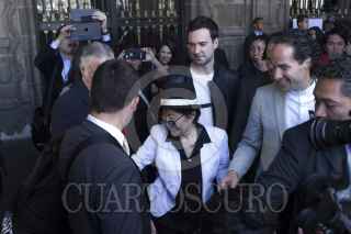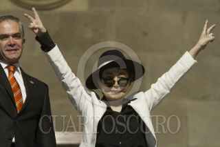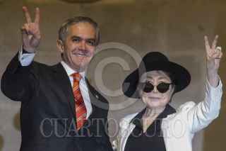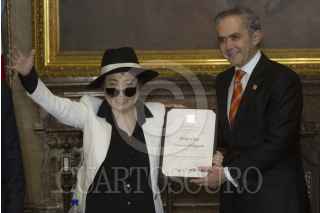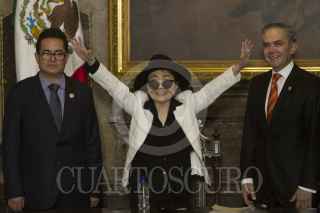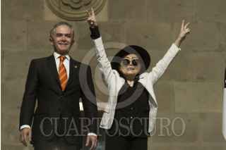 CIUDAD DE MÉXICO, 03FEBRERO2016.- La artista plástica Yoko Ono, legendaria por ser la pareja sentimental del músico John Lennon, fue nombrada como visitante distinguida de la ciudad en el salón de Cabildos del Antiguo Palacio del Ayuntamiento, el pergamino se lo entregó el Jefe de Gobierno Miguel Ángel Mancera. FOTO: MOISÉS PABLO /CUARTOSCURO.COM