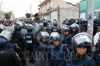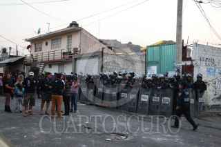 MÉXICO, D.F., 04FEBRERO2016.- La disputa por un predio derivó en un enfrentamiento que dejó al menos una decena de personas heridas y dos vehículos incendiados. Los hechos ocurrieron alrededor de las 15:07 horas, en la esquina de las calles Puerto Marqués y Benito Juárez, en la colonia Polvorilla, en la delegación Iztapalapa, De acuerdo con los primeros reportes, presuntos integrantes del Frente Popular Francisco Villa se enfrentaron con habitantes del predio con golpes y piedras. La policía capitalina informó que al parecer es por una disputa entre dos grupos rivales de este Frente por el predio “Centauro del Norte” localizado en Benito Juárez y 1ra cerrada de Benito Juárez. Policías antimotines de la SSP-DF, reguardaron el predio para que no se suscitara otra gresca. FOTO: SAÚL LÓPEZ /CUARTOSCURO.COM