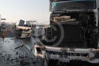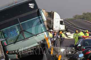 TULTITLAN, ESTADO DE MÉXICO, 05FEBRERO2016.- Una persona perdió la vida y 35 personas resultaron lesionados después que un trailer y un autobús chocaran y se impactaran contra el muro de contención en el kilómetro 22 del Circuito Exterior Mexiquense. FOTO: SAÚL LÓPEZ /CUARTOSCURO.COM