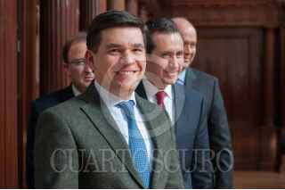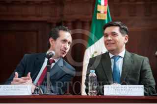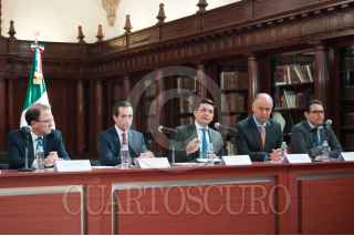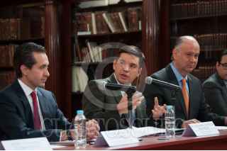 CIUDAD DE MÉXICO, 05FEBRERO2016.- Fernando Aportela Rodríguez, subsecretario de Hacienda y Crédito Público; Juan Carlos Cortés García, Director General de la FND y José Bernardo González Rosas, titular de la unidad de banca de desarrollo, durante la firma del préstamo del Banco Mundial a la Financiera Nacional de Desarrollo Agropecuario, Rural, Forestal y Pesquero (FND), para la expansión de las finanzas rurales. FOTO: DIEGO SIMÓN SÁNCHEZ /CUARTOSCURO.COM