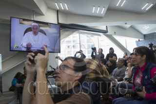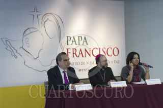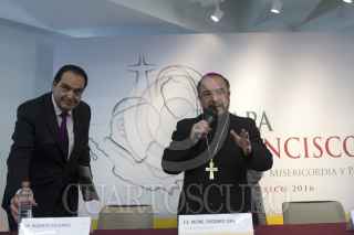 CIUDAD DE MÉXICO, 07FEBRERO2016.- Roberto Delgado, encargado de los voluntarios que participarán en las vallas durante los recorridos del Papa Francisco, y Monseñor Eugenio Lira, coordinador general de la visita del sumo pontífice, durante la conferencia de prensa a unos días de la llegada del Papa Francisco a nuestro país, durante el encuentro con los medios de comunicación mostraron un video del jerarca religioso en el cual manda un mensaje previo a su llegada a territorio nacional. FOTO: MOISÉS PABLO /CUARTOSCURO.COM