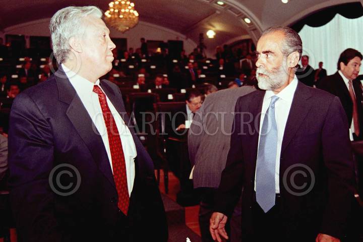 Diego Fernández de Cevallos conversa con Raymundo Cárdenas en la sesión del senado. FOTO: Juan Pablo Zamora/CUARTOSCURO.COM